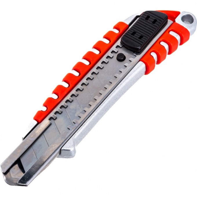 Лезвие шириной 18 мм, изготовленное из стали У8А, фиксируется автоматически. Когда крайний сегмент затупляется, его можно отломить и продолжить использовать инструмент.