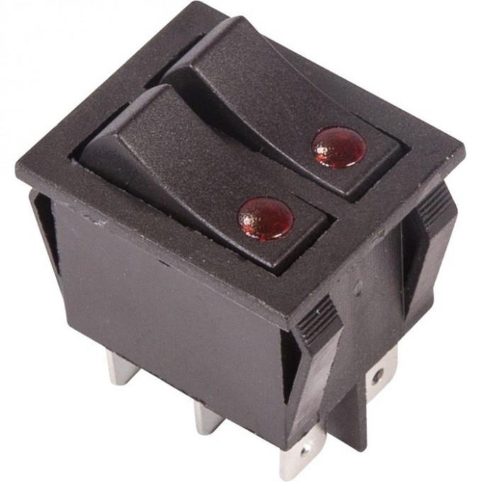 Выключатель клавишный 250V 15А (6с) ON-OFF черный с подсветкой ДВОЙНОЙ предназначен для коммутации электрических цепей переменного тока напряжением до 250В. Клавишные (Рокерные) выключатели применяются в качестве комплектующих изделий различного электрооборудования (в сетевых фильтрах и удлинителях, аудио-оборудовании, блоках питания, электроустановках на различных производствах, автомобилях, и многих других местах). Такой клавишный переключатель имеет два положения и две клавиши, что позволит раздельно коммутировать контактные группы. Принцип действия основан на перемещении клавиши в одну из позиций. Для переключения в нужное положение требуется приложить некоторые усилия на клавишу. Монтаж осуществляется без применения винтов на плоских панелях толщиной от 0.8мм до 3мм. Подключение контактов осуществляется плоской клеммой 6.6мм либо с помощью пайки.